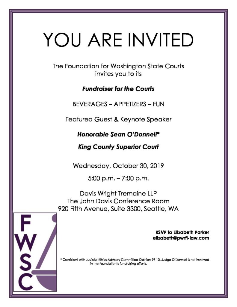 The Foundation for Washington State Courts invites you to our Fundraiser for the Courts to be held on Wednesday, October 30th from 5-7 p.m.